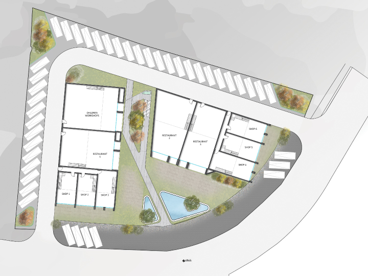 At the heart of the project, an open garden acts as the central attraction and common outdoor seating space for the entire development. Its landscaping and maintenance are provided to ensure a welcoming shared environment. Along the peripheral sides of the project, parking spaces are integrated, alongside practical service circulation linked directly to the backdoors of shops and restaurants, ensuring smooth operations without disrupting the visitor experience.